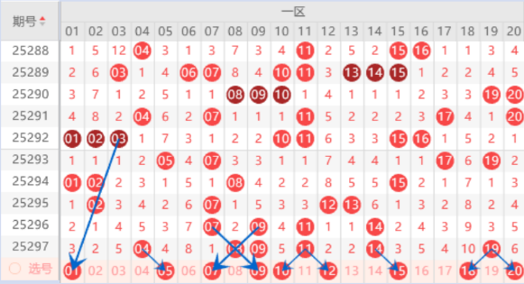 该区间的01号数字是属于三斜连号码,出号机会是有的,我们可以防守一下01 05号数字同出的情况。本期的07号数字是属于空一对称号码,本期也是有出号机会的,我们可以防守一下07 09号数字同出的情况。上期开出了09 11 14号数字的重号,本期我们注意一下出一个三重号码的情况,其中的09号数字我们可以关注一下,本期可以防守一下09 10号数字同出的情况。上期开出了19号数字,本期我们注意一下走分边的情况,所以本期的18 20号数字我们注意一下出一个号码的情况。