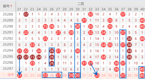 该区间的21 22 24号数字本期我们注意一下出一个号码的情况,其中的21 22号数字可以重点关注一下出号情况。本期的25 26 27号数字是属于重号26号数字的边号回补号码,本期是有机会出一个号码的,我们重点关注一下25 27号数字的出号情况。本期的30号数字我们防守一下出号情况,本期可以防守一下29 30号数字同出的情况。本期的37号数字是属于121走势,出号机会也是有的,我们可以防守一下出号情况。