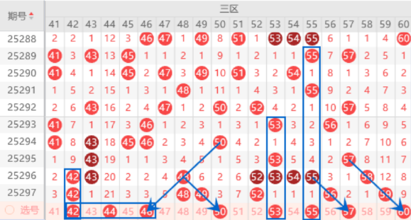 该区间的42号数字我们注意一下出三重的情况,本期可以防守一下42 44号数字同出的情况。本期的45 46号数字我们注意落下一个号码的情况,其中的46可以重点关注一下。四连号52 53 54 55上期开出了52号数字的重号,本期我们注意一下53 54 55号数字落下一个号码的情况,其中的54 55号数字可以重点关注一下。本期的57号数字是属于三斜连号码,60号数字是属于四斜连号码,本期可以防守一下57 60号数字同出的情况。