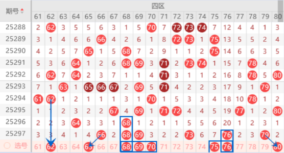该区间61 62号数字我们注意一下落下一个号码的情况,其中的62号数字可以重点关注一下。该区间上期开出了66 68 69号数字的连号空一带号,本期我们注意一下出重号的情况,其中的69号数字可以重点关注一下,本期可以防守一下69 70号数字同出的情况。上期开出了73 76 79号数字,都是属于0路号码,我们注意一下出一个重号的情况,中间号码74 75 77 78号数字我们也还是关注一下出号情况,其中的75 77号数字可以重点关注出号情况。