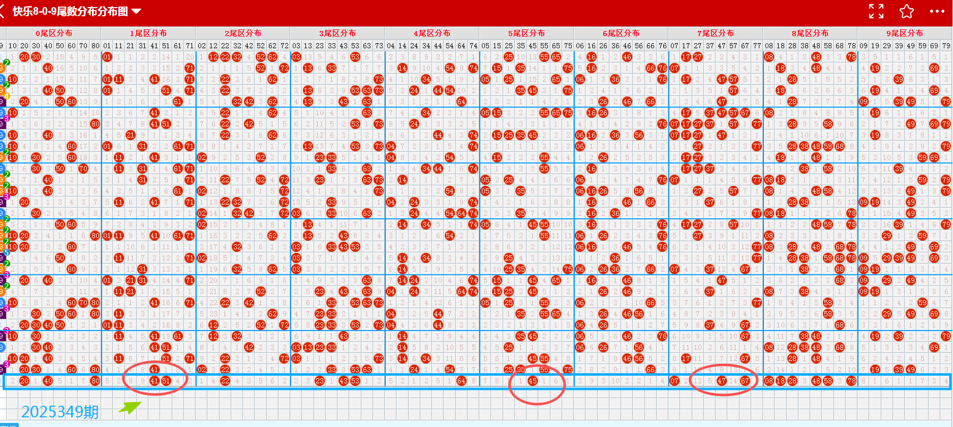 上图是快乐八2025349期的尾码走势图,从图中看0尾到9尾出号个数依次是:0尾号码区开出3个;1尾号码区开出2个;2尾号码区开出1个;3尾号码区开出3个;4尾号码区开出1个;5尾号码区开出1个;6尾号码区开出0个;7尾号码区开出3个;8尾号码区开出6个;9尾号码区开出0个;再看小尾号码(0尾-4尾)区有10码,大尾号码(5尾-9尾)有10码;数据比对统计后可以看到本期8尾出号数量最多,一共开出了6个中奖号码。本期6、9尾出现断区!由走势比对推断2025350期重点需要关注1、5、7尾区号码下号热度回补和落号数量增加的概率较大。
