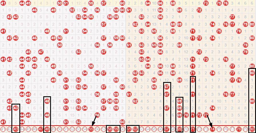 第四小区间61-80上期该区间开出0个号码,本期的走热的几率也是比较大的,这里的61 67的组合和62 67的组合参考下开出的几率是比较大的这里的63 64 65的组合防守下这里的70 77的组合和67 70的组合关注下开出的几率也是比较大的这里的67 70的组合和68 70的组合关注下开出一组的几率是比较大的看好68 70的组合的开出,这里的70 80的组合和70 79的组合关注下开出的几率也是比较大的本期的77 79的组合防守下回补的几率是比较大的本期的72 75的组合和72 80的组合参考下落号的几率也是比较大的本期的71 74的组合和71 77的组合参考下本期的71 80的组合和79 80的姐妹组合开出一组的几率也是比较大的这里比较看好71 80的组合的开出