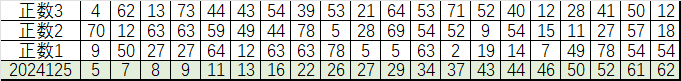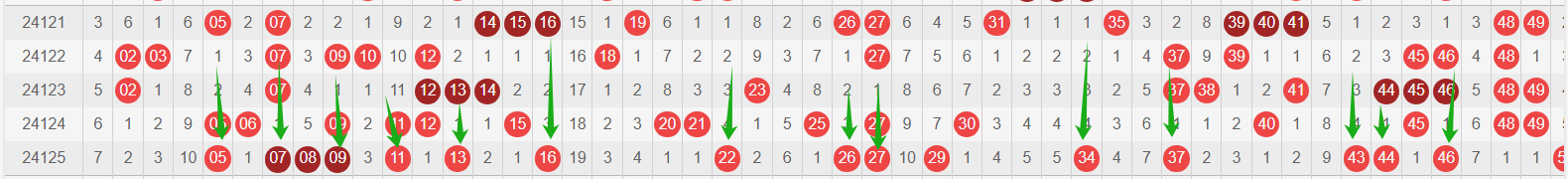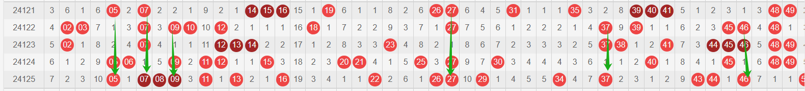 我感觉选热的同时,还要注意防冷条件开出,可以直接选取每个号码跟随出次前三的号码,也可以考虑把出次最后的三个数字加进去,不过这样可能号码太多,可以尝试。图上也能看出单独号码跟随的情况,我就不一一统计每个号码的出次了,我这里考虑提高概率,取每个号码历史跟随的前三号码和后三号码,根据2024125期的号码,我关注正数3和倒数3的号码号码为: