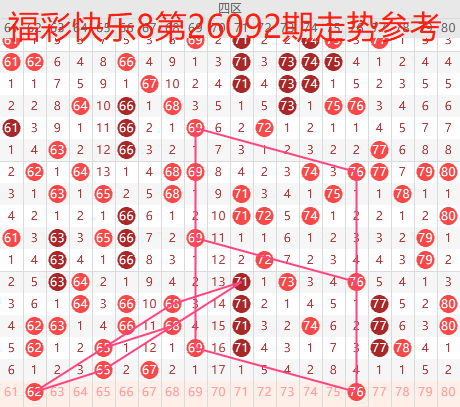 福彩快乐8是从01-80个号码中每期开出20个号码,我们把80个号码分为四个区:一区01-20号,二区21-40号,三区41-60号,四区61-80号