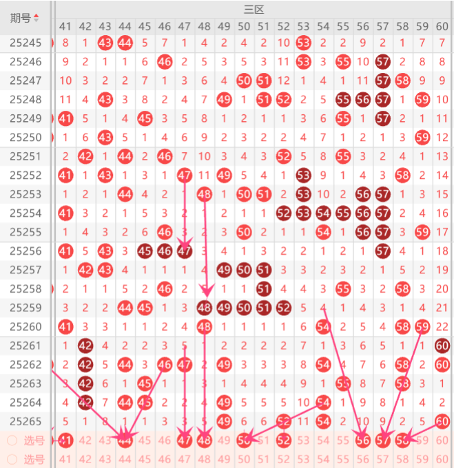 而三区的打底号是41.43.44.45.46.47.48.50.54.56.参考2码开出机会,