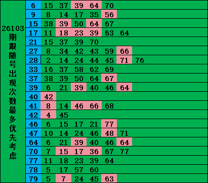 选出大底后在跟随号中优先选择近期连续出现的跟随号,次数最多的优先考虑!
