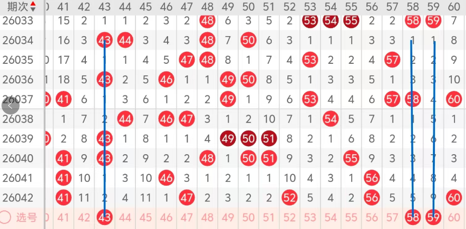 第三区间的走势分析:第三区间上期开出了五个号码球,主要的落号点位在三区间的后半区,走出了两奇三偶的形态走势,上期三区间的前半区落下了两个号码球,后半区落下了四个号码球,整个三区间处于温态的趋势,根据三区间的走势规律,今天的三区间我们主看前半区43这个热码的落位,再看后半区58 59组合的落位,也是热码组合,冷码的回补,这三个号球建议大家打个三胆拖,或者打个三码复二比较稳妥,参考为主!