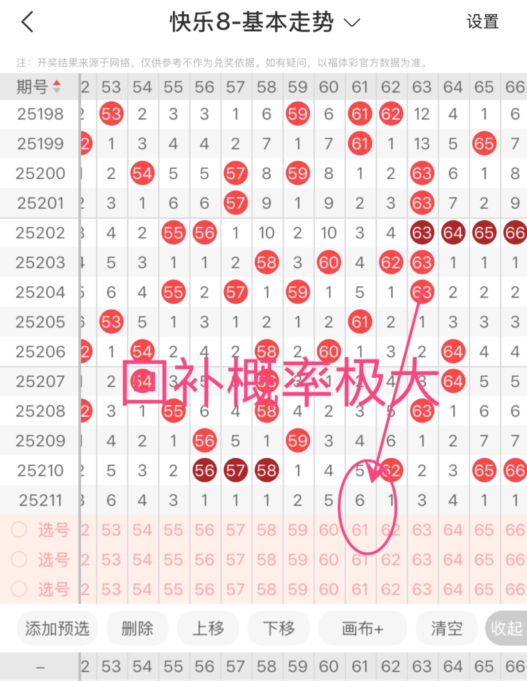• 遗漏总值:近5期遗漏总值在36-78之间波动,上期为48,预计本期可能回升至54附近,需关注遗漏4期以上的温码回补(如11、21、56)。