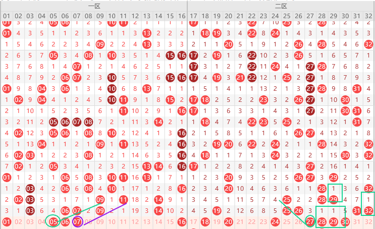 二区胆尾8尾,本期接着关注边号重号,边号18 19 24 25 26 27 30 31 32要出1-2码,形态上27是三斜连,上图已勾画,防27不出出17,0尾最近二期回补,所以本期20 30大概率要出一码,重号19 25 26 31 32要出一码,看好19,隔一期号出二期,本期28 29 符合,那么就是29 28二出一,结论是本期关注五码 17 19 24 28 30