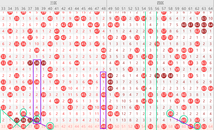 三区胆尾8尾,三区8尾最热连出三期上图已勾画,如果本期不断,那就是38 48 二出一,三区重号不连出,边号没断,本期边号34 35 36 37 38 39要出号,形态上34 36 38 40是斜连号,上图已勾画,三直落不出就看34 40 ,防45,本期关注五码34 35 40 45 48