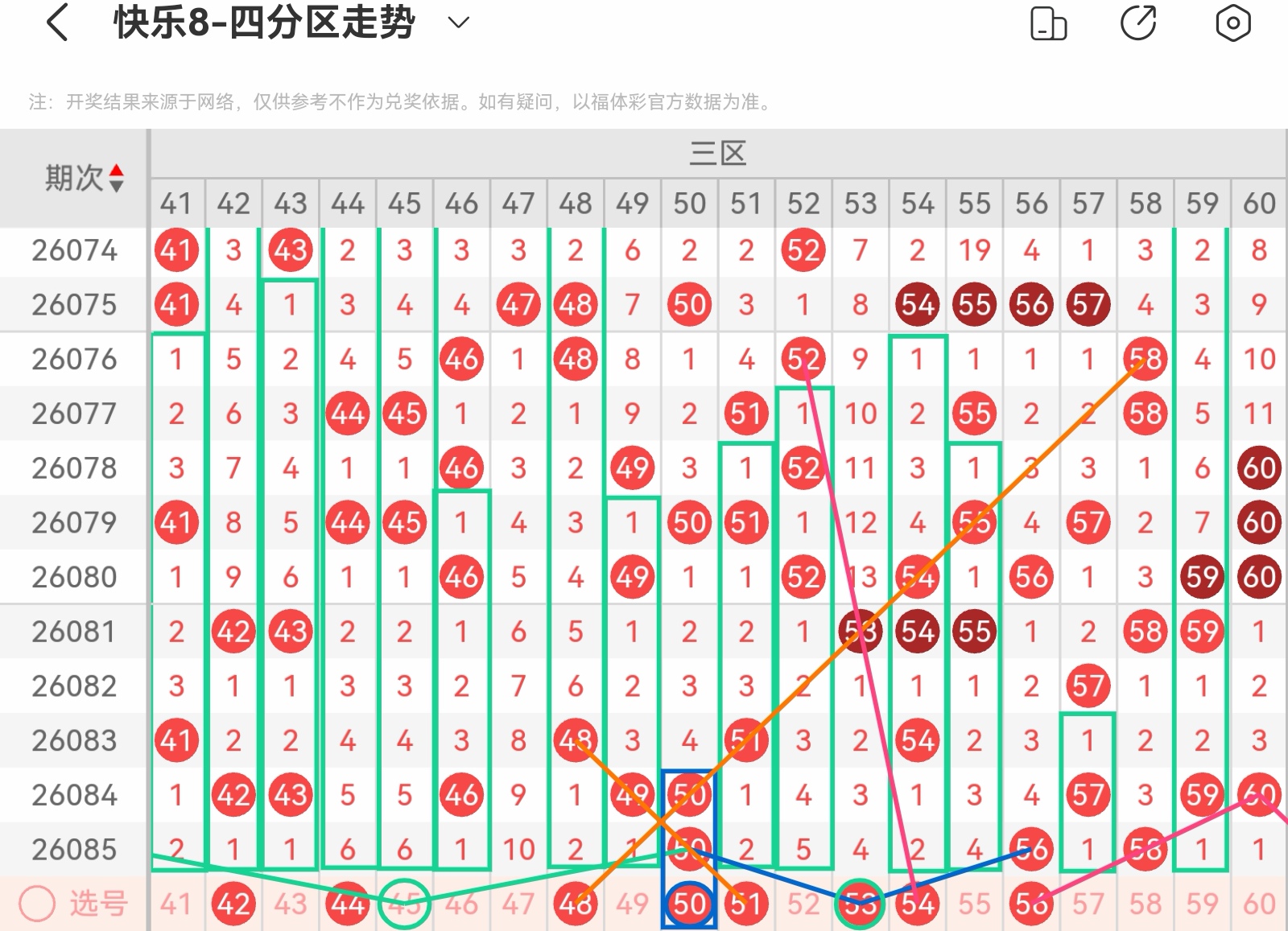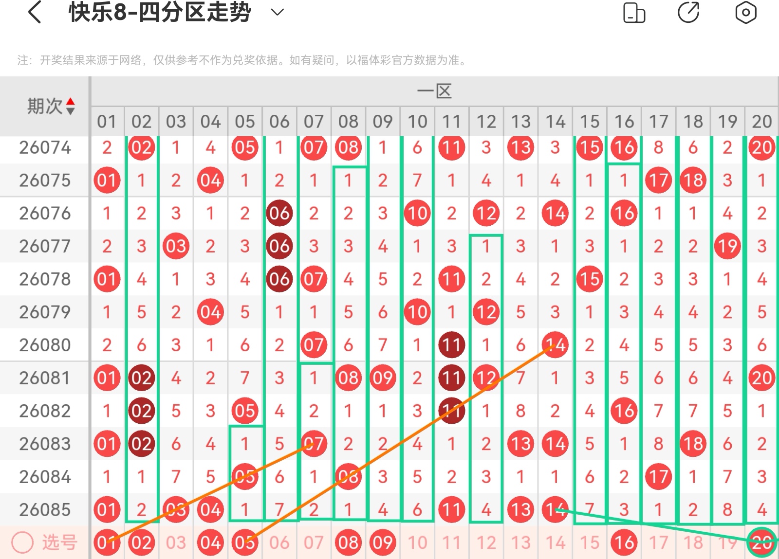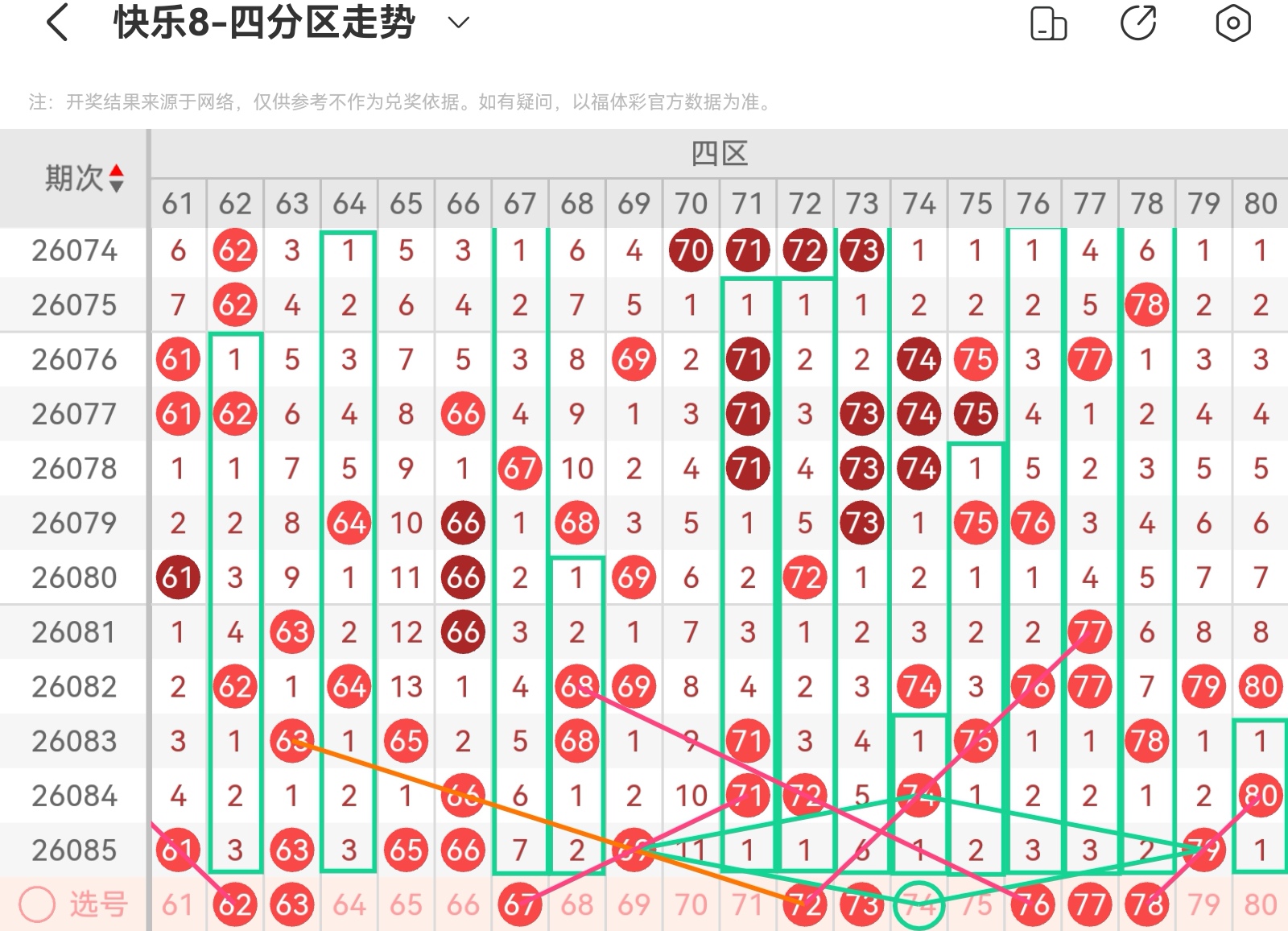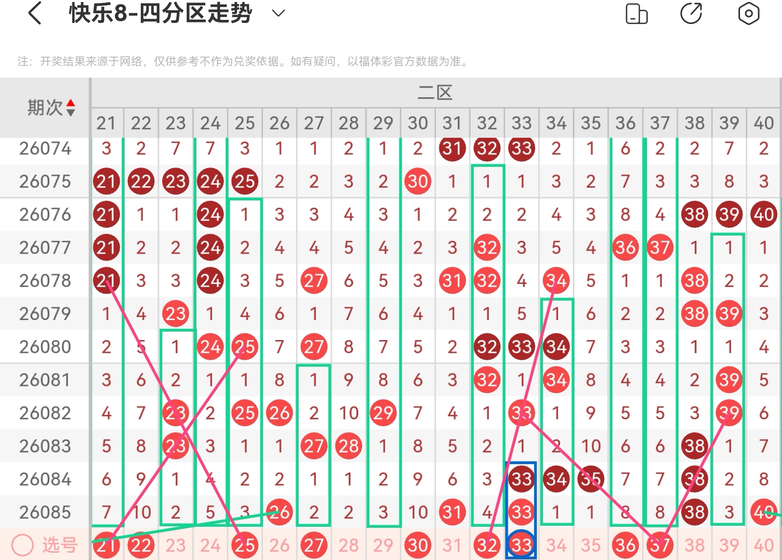 大家好,我是甜丝丝的坏事,主要以快乐八的形态走势、空位走势、遗漏走势以及斜连走势相结合的方法,用公认的四分区走势来进行预测分析,希望能让你有所收获。