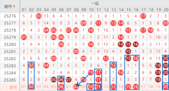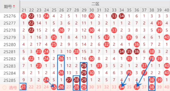 该区间的21号数字是属于遗漏9期的号码,本期遗漏9期的号码有5个,出一个号码机会很大,所以本期的21号数字我们可以关注一下出号情况。本期的25 26号数字我们注意一下出号情况,本期的25 26号数字是属于阶梯号码,可以防守一下同出的情况。三连号28 29 30号数字我们注意一下出重号的情况,其中的28 29号数字可以重点关注一下。本期的30 31号数字也是要防守一下同出的情况。本期的38号数字是属于对应斜连号码,可以防守一下出号情况。