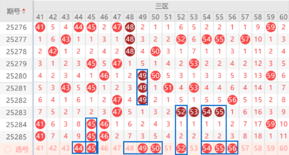 该区间上期开出了45 46号数字的重号,本期我们注意一下出一个三重号的情况,其中的45号数字可以重点关注一下。本期的48 49 50号数字是属于重号49号数字的边号回补号码,本期是有机会出一个号码的,其中的49 50号数字我们可以重点关注一下出号情况。四连号52 53 54 55号数字已经断号2期了,本期应该是要落号了,我们重点重点关注一下54 55号数字出号情况。本期的56号数字我们注意一下出号情况,本期可以防守一下54 56号数字或者55 56号数字同出的情况。