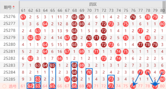 该区间上期开出了63 73号数字,本期我们防守一下出重号的情况,如果看好63号数字我们就防守62 63号数字同出的情况,如果看好73号数字我们就防守70 73号数字同出的情况。本期的68号数字我们可以防守一下出四重号的情况,本期可以防守一下68 71号数字同出的情况。本期的65号数字是属于空三中心号码,本期的空三中心号码有2个,是有机会出一个的,本期可以防守一下65 70号数字同出的情况。