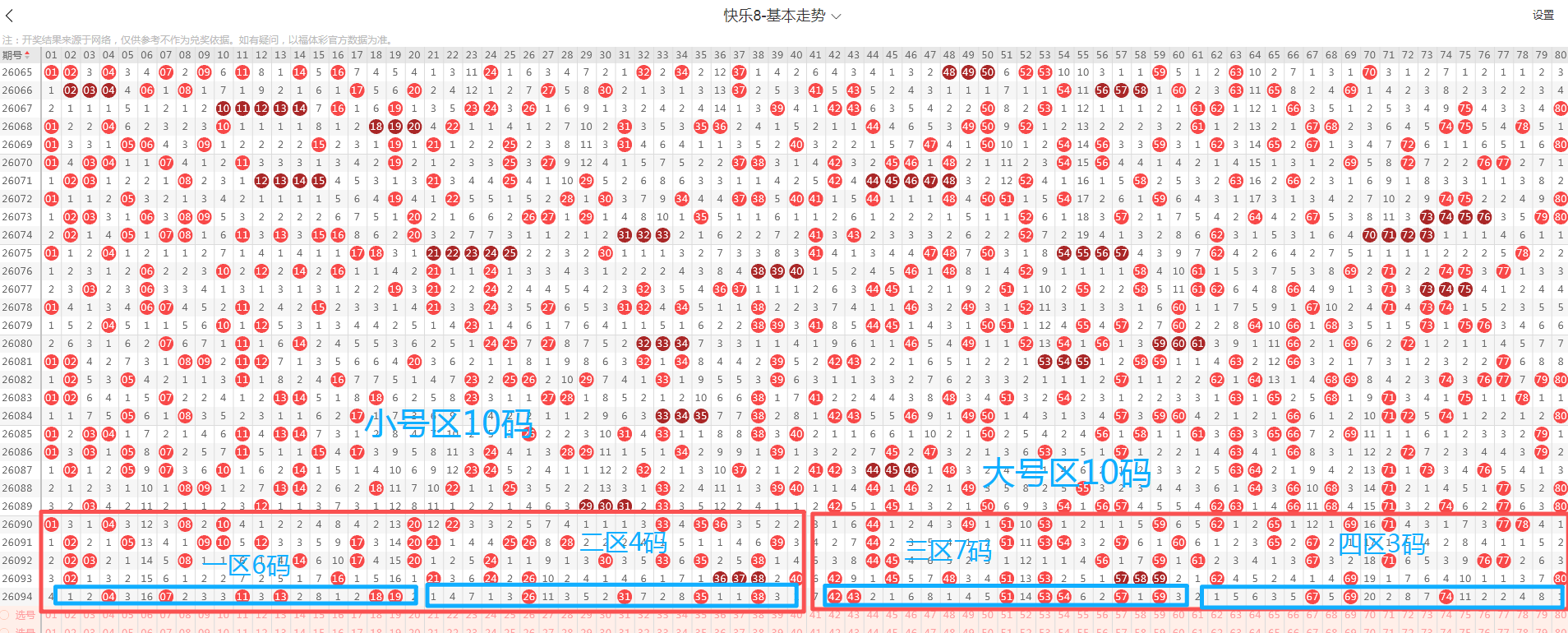 上图是快乐八2026094期区间走势图,从图中看到小号区(1-40)开出10个出奖号码,从开出数量上看与上期开出数量增加,热度上升温,从小号区近10期出号情况看,整体小号区前区近期偏温趋势;大号区(41-80)本期开出了9个出奖号码,从开出数量上看与上期开出数量减少,热度降温,从近期出奖号码个数看属于偏温态势,下期快乐八2026095期大号区号码大概率热度回温反弹,大小区间主看大区号码热度回温概率较大,大小比具体区间比可参考12:8,防10:10的比例;再从细分区间来判断,按走势图四分区分成四个区间,一区(1-20)开出来的号码有6个;二区(21-40)开出来的号码有4个;三区(41-60)开出来的号码有7个 ;四区(61-80)开出来的号码有3个;数据上看本期出奖号码集中分布在三区。从号码落位区间形态上看,快乐八2026095期主看二、四区热度回暖的态势,落号几率较大,建议密切关注。