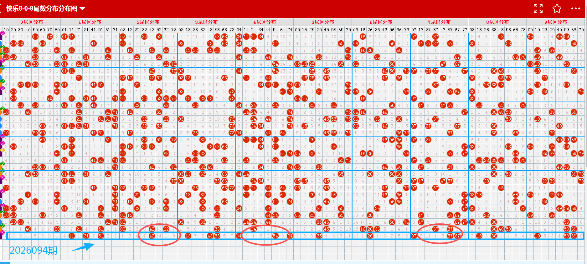从2026094期重码走势图上看,画蓝色方框图标的是开出来的重码,开出了8个(蓝色方块标示的),重码数量与上期增加;从重码图上看,近10期重码下号数量有呈现降温的趋势。从近期重码下号数量的比对,可以发现中奖号码数量在1-10个号码之间均衡下号。综合推断本期重码热度回温概率极大,本期推断可以参考7个左右(蓝色箭头标示的);建议多加关注(11、31、43、53、59、67、69);