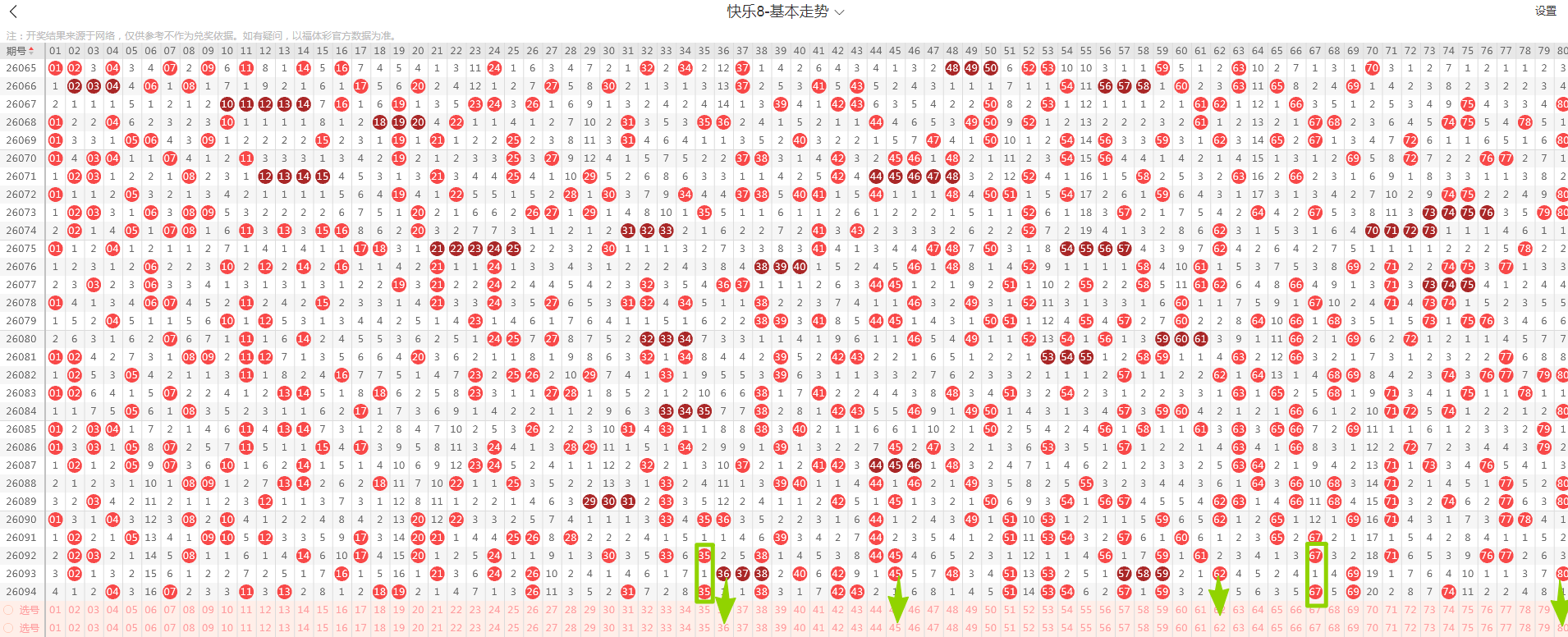 从这张走势图可以看到绿色方框标出来了遗漏一期的示意号码,开出了隔期(遗漏一期的)2个号码(绿色方块标示的),数量与上期减少,从近期走势图看隔期码回温态势形成,本期判断热度继续回温,落号4个号码概率较大(绿色箭头标示的36、45、62、80)需要关注,有下号概率;
