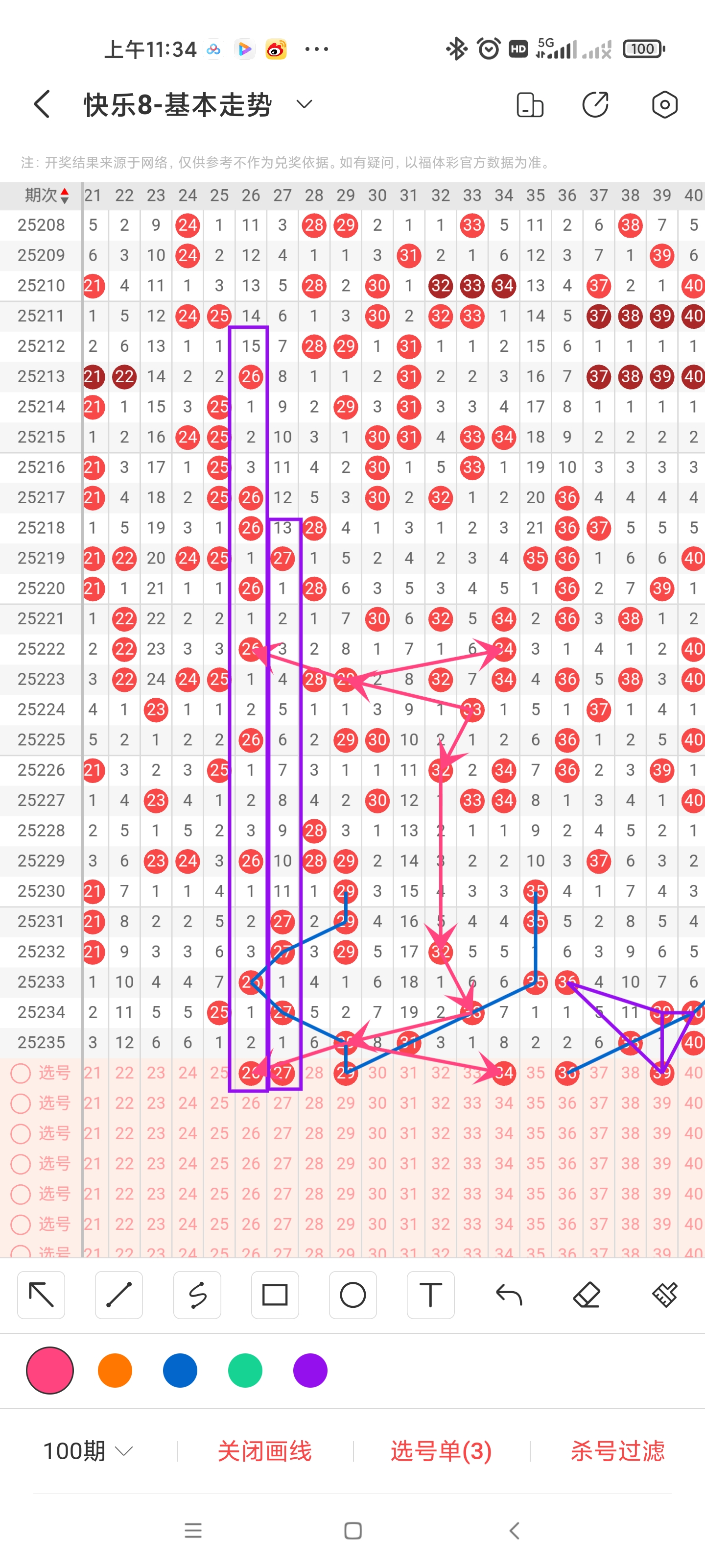 二区间上期稳定落号,一共开出四个号码球,本期考虑等同数量的号码球,注意百期相似形态的26、27号码球,注意斜连走势回补的29、36号码球,以26号码球为对称走势起点,注意走势形态的29号码球,以32号码球为对称走势起点,注意走势形态的26、34号码球,注意百期相似形态的39号码球,期数增减法注意21、33号码球。因此二区间关注21-26-27-29-34-36-39。注意本区间的选二26-36、27-29。