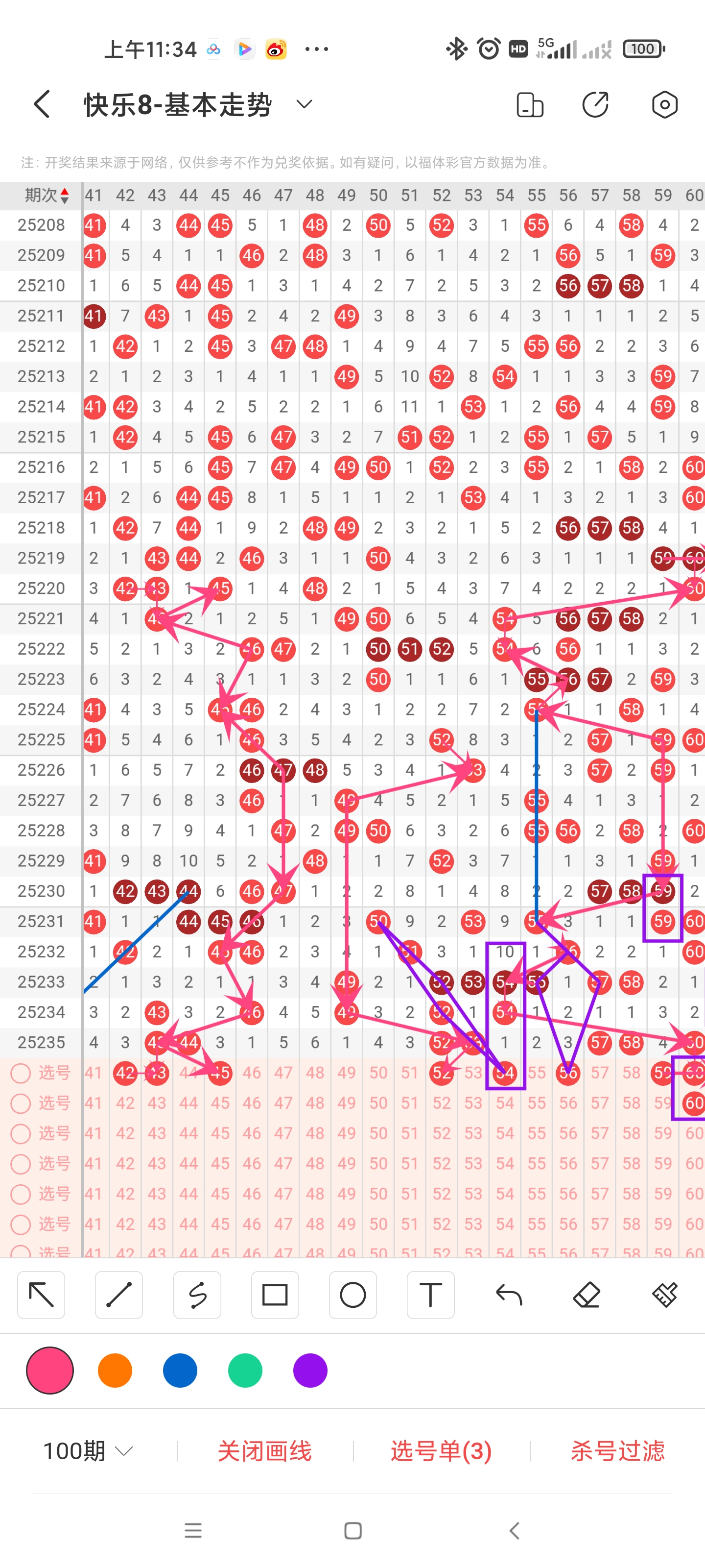 三区间上期小面积增加落号,一共开出七个号码球,本期考虑减少号码球的数量,阶梯落位重码走势注意60号码球,注意百期相似形态的54、56号码球,以47号码球为对称走势起点,注意走势形态的42、43、45号码球,以49号码球为对称走势起点注意走势形态的52号码球,注意斜连走势构成平行四边形形态的54号码球,以55、59号码球为对称走势起点,注意走势形态的59、60号码球,期数增减法注意41、48、56、59号码球,因此三区间关注42-43-45-52-54-56-59-60。注意本区间的选二43-52、56-60。