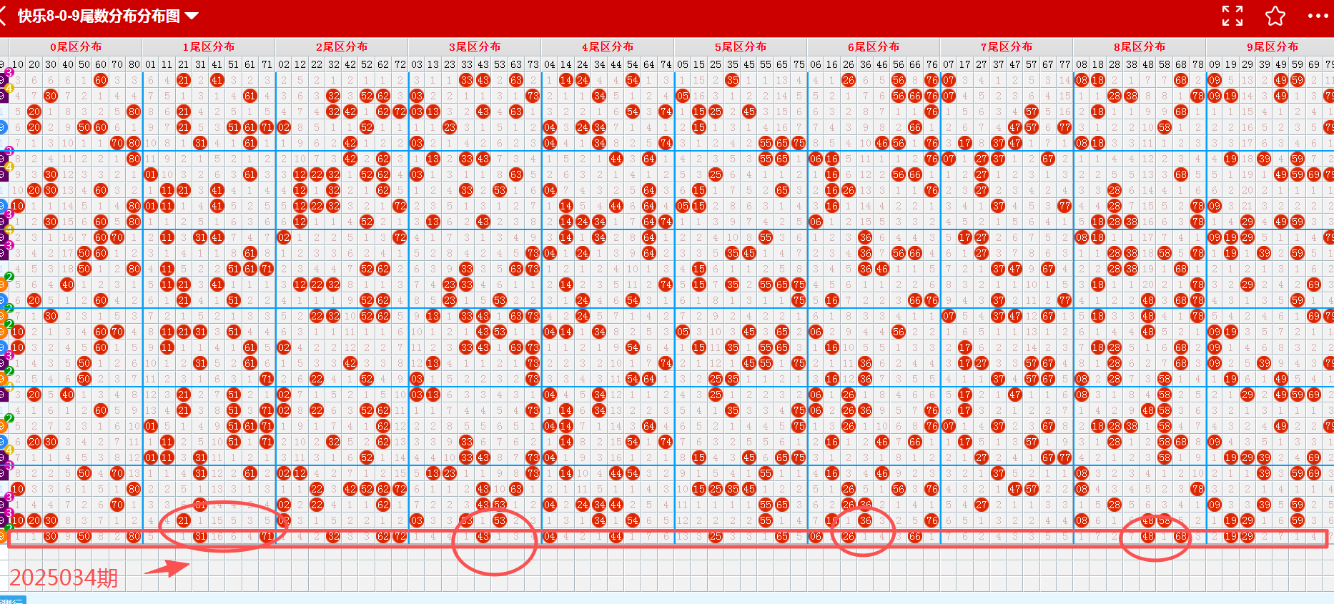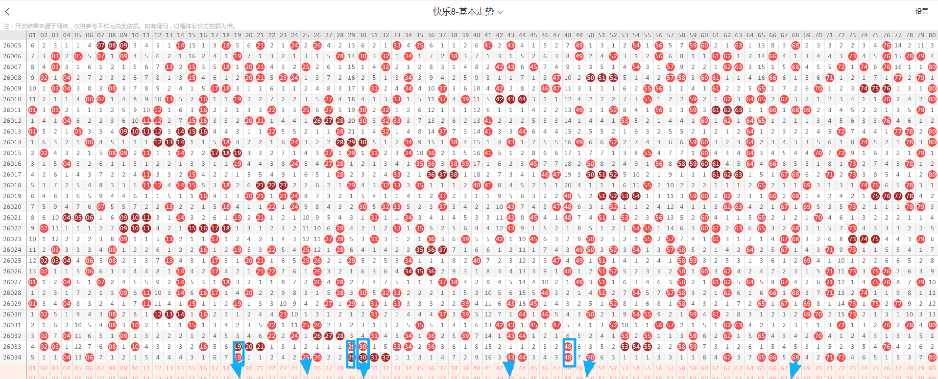 从这张走势图可以看到我画标出来了遗漏示意号码,开出了隔期(遗漏一期的)7个号码(绿色方块标示的),数量与上期升温,从近期走势图看隔期码回温态势形成,本期判断热度回温,落号6个号码概率较大(绿色箭头标示的10、16、36、54、59、76)需要关注,有下号概率;