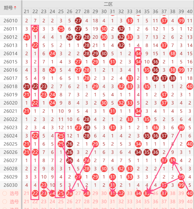 二区间注意打底号是22.24.26.27.28.31.32.34.35.37.40中关注3-4码开出机会,