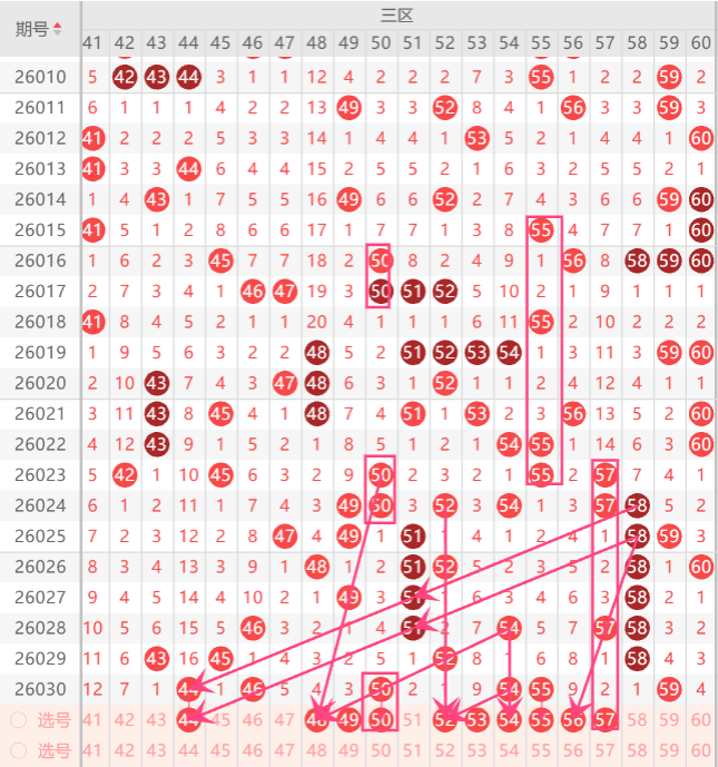 而三区的打底号是44.42.48.49.50.52.53.54.55.56.57.中参考3-4码开出机会,