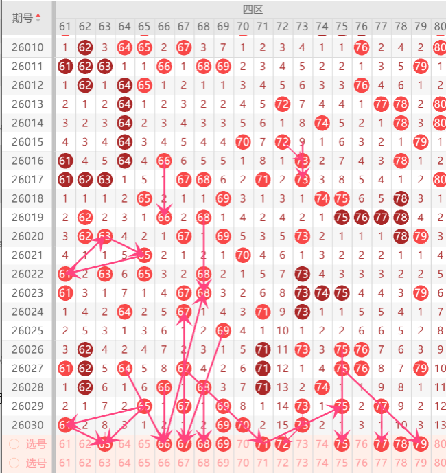 四区间的打底号是63.64.66.67.68.72.75.77.78.79中参考3-4码开出机会