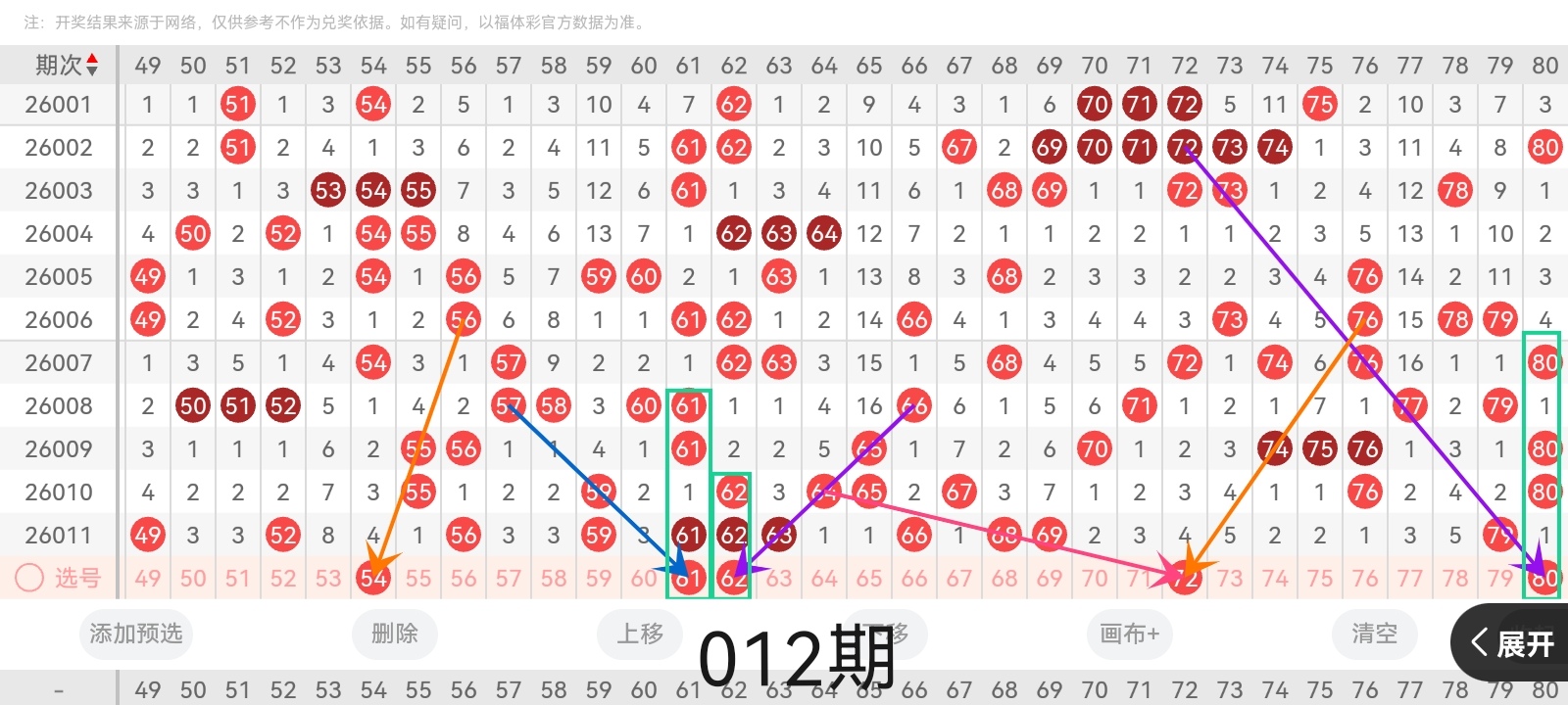 小梁结合上图中的画线思路得出:号码54与前几期开出的号码呈隔四期回补的走位且呈左斜三连的走势;号码61是上期开出的重号并呈前后相互对称的走势且与前几期开出的走势呈左斜连右斜三连的走位;号码62是前两期开出的重号且与前几期开出的号码呈左斜五连的走势;号码72与前几期开出的号码呈左右斜三连的走势且呈隔四期回补的走位;号码80与前几期开出的号码呈隔期回补前后相互对称的走位且呈右斜三连的走势。
