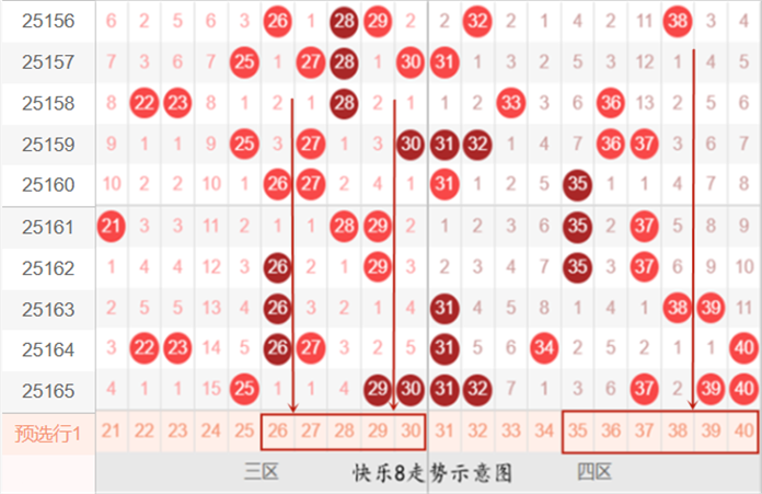 第三区间,上期开出三码,目前此区间处于大热区间,根据走势分析预计本期此区间将在中后端开号,预计将出现走冷趋势。
