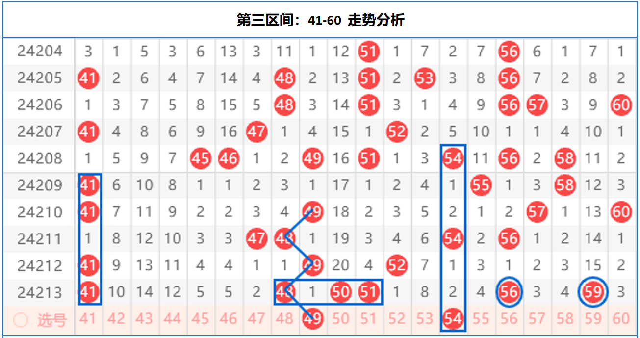 三区分析:【41-60】(走势图标注号码非小黄车大底,请谨慎参考,具体思路将在直播间分享讨论)