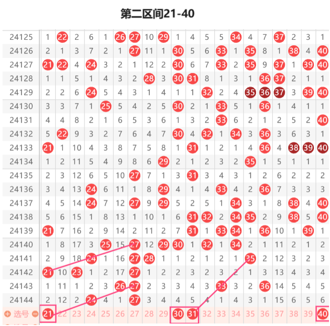 该区间上期开出2个号码本期的走热几率还是可以重点关注下的,首先我们看上期该区间的遗漏1的没有开出该区间也是三期没有开出遗漏1的号码本期的落号几率是比较大的,本期的遗漏1的我们要关注下33 36落一码的几率是比较大的这里可以关注下33的开出,先看37是本期的最大遗漏本期的落号几率是比较大的这里可以关注下36 37的姐妹组合的开出,这里可以关注下21 31的组合开出,本期的24 34的组合开出的几率是比较大的,32 34 35的组合开出的几率是比较大的,这里可以重点关注下29 36的组合和37 40的组合,本期的38 40可以重点关注下开出的几率是比较大的这里个人更看好40的回补开出,本期的33 39的组合和28 39的组合重点关注下,36 39的组合重点关注下开出的几率也是比较大的这里可以关注下32 39的组合开出和32 36的组合开出本期的24 29的组合重点关注下本期的重号我们关注下30 31的姐妹组合的开出