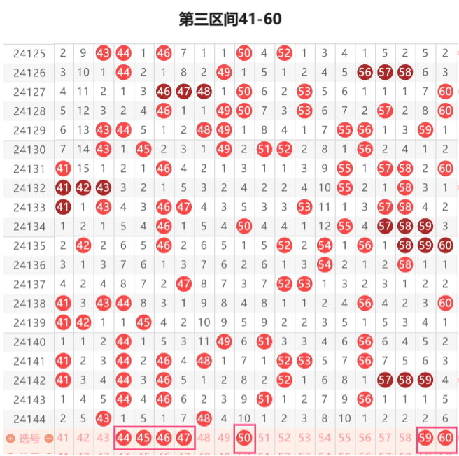 该区间上期开出2个号码,上期该区间突然走冷本期该区间走热点几率是比较大的,该区间上期开出遗漏1的号码没有开出,那么本期的遗漏1可以关注下46 56这里开出一个的几率是比较大的这里我个人比较看好56的开出,这里的59 60的组合本期的落号几率是比较大的,51 59的组合本期开出的几率也是比较大的,41 47的组合和43 53的组合本期可以重点关注下,本期的41 43的组合落号的几率是比较大的这里可以重点关注下,43 49的组合本期的落号几率也是比较大的,49 54的组合和49 56的组合都可以关注下开出一组的几率是比较大的,重点关注下54 60的组合和59 60的组合开出本期的58 60的组合和53 54的姐妹组合本期的落号的几率都是比较大的48 49的姐妹组合本期也要防守下本期的46 50的组合落号的几率是比较大的这里可以重点关注下,44 46的组合本期的落号的几率也是比较的大的