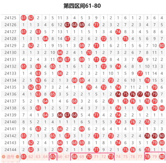 该区间上期开出6个号码本期的多开的走势不是很大,先看该区间上期的遗漏1的71 78开出,本期遗漏1的68 79这里比较看好79的开出,上期的62的双重开出本期的66三重的几率是比较大的这里可以关注下65 66的组合开出,77本期的落号几率是比较大的这里可以重点关注下,80本期这里可以重点关注下,74本期的回补几率是比较大的71 77的组合和74 77的组合可以重点关注下开出一组的几率是比较大的,61 63的分边形态本期可以重点关注下开出的几率是比较大的防67 70的组合开出77这个号本期的落号几率也是比较大的本期的64 73的组合和63 74的组合可以重点关注下落号的几率是比较大的