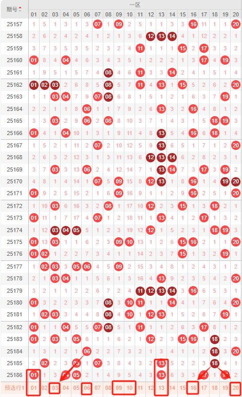 一区:最近一区10期出号情况为:5 4 5 6 7 6 7 3 5 6,总出号情况为53个,平均出号5.3个,本期推荐一区号码回补推荐出号为:01 03 06 09 10 13 16 20。重点关注:06 09 13 16 20。