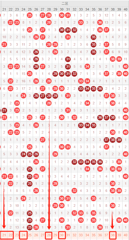 二区:最近二区10期出号情况为:6 6 5 4 4 4 3 5 7 4,总出号情况为49个,平均出号4.9个,本期二区号码还是比较弱势推荐:21 22 24 28 30 38 。重点关注:21 22 28。
