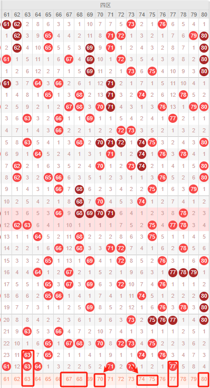 四区:最近四区10期出号情况为:5 5 5 4 4 5 2 7 4 6,总出号情况为47个,平均出号4.7个,本期四区号码推荐:63 67 68 70 74 75 77 80。重点关注:67 68 70 74 77 80。