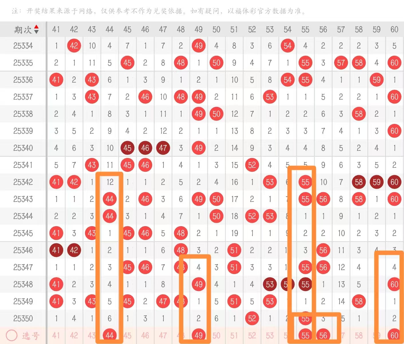 三区41—60:三区在四头经过一次热区之后,上期也是来到了断档的情况,给到了40 52中间没有组个号,本期在空一的形态当中最多拿两把,除此之外更多的时候选择的应该是在侧重优势点位上比较明显的两期回补的49,在之前4052开当中只补了两就是48 49,本期的做的时候也可以去以对子的形态去涵盖,除此之外更看好的是49去搭配5字头的号码,5字头本期的优势点就在于55和56的对子形态,这种号码可以去打三角形,因为近两期他都是以这个形态去出现的。