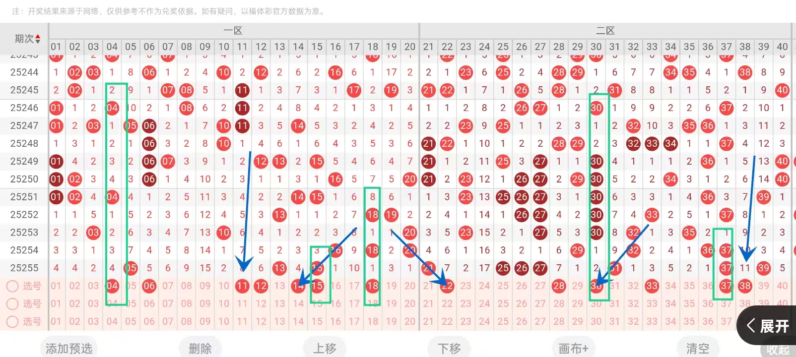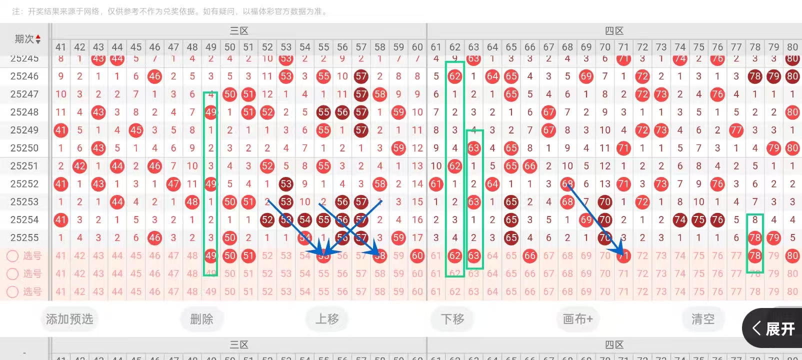 第2025256期福彩快乐8通过以下走势图及三四区间预测分析如下: