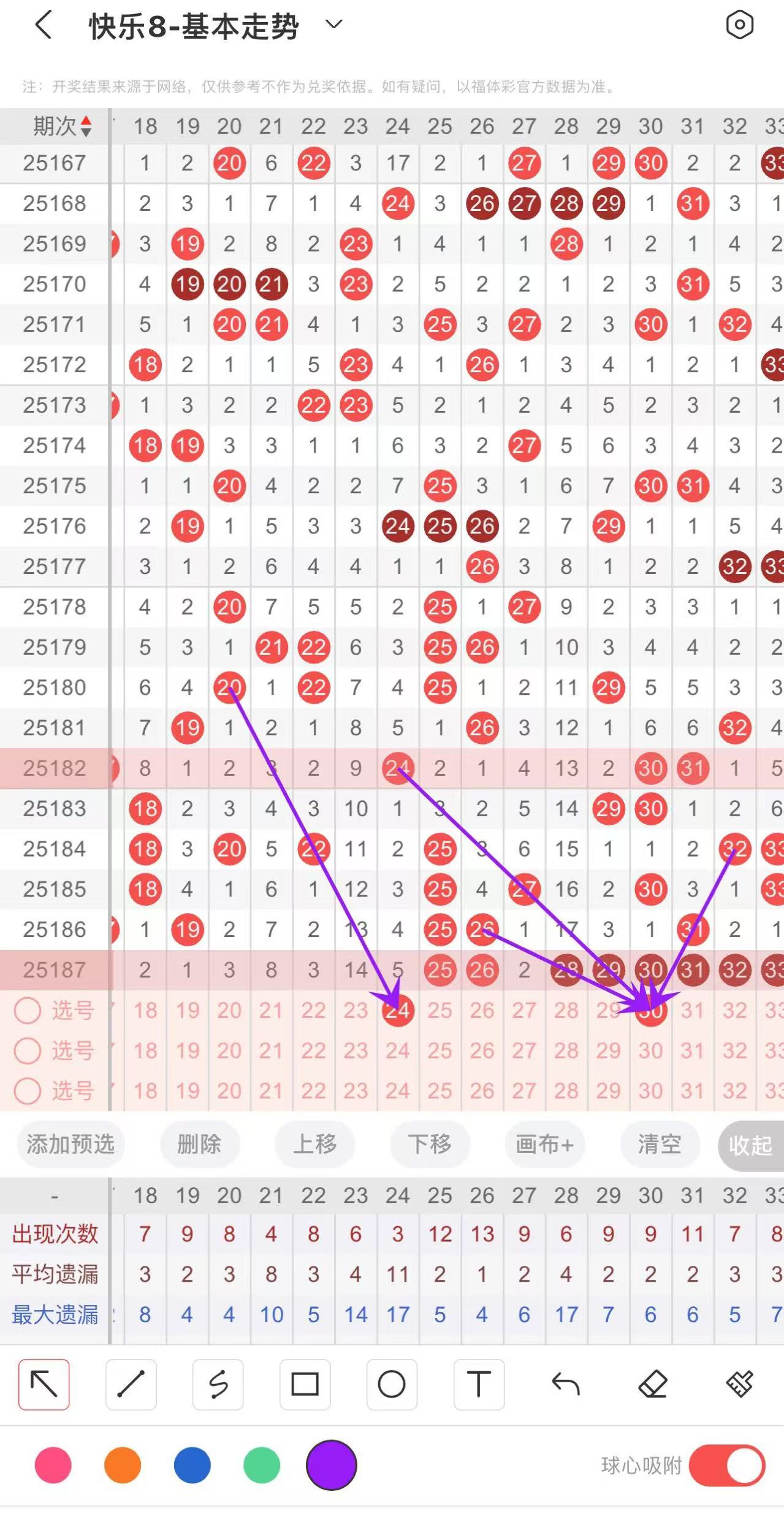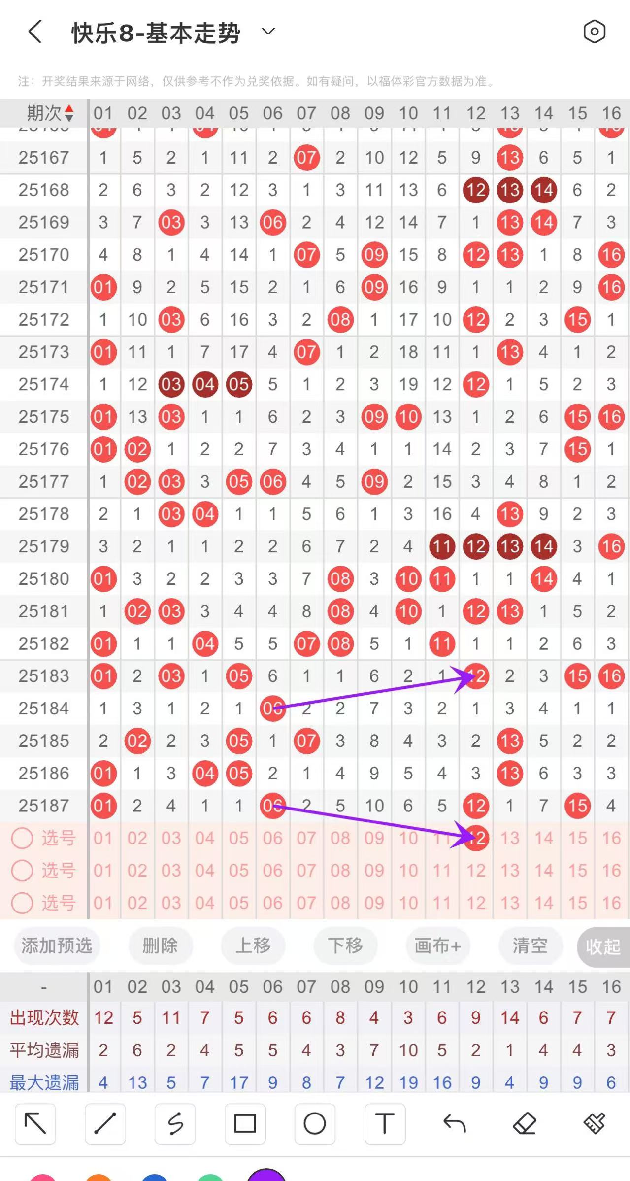 接下来的分析是这样子,分别从每个分区里面挑出啊,最看好的那个号或者是组合。首先看。第一分区01~20号。我还是看到了一个重号,这个重号就是12号。12号重的可能性还是非常大的。也是主要根据这个6.6.12.12的结构,家看看走势图