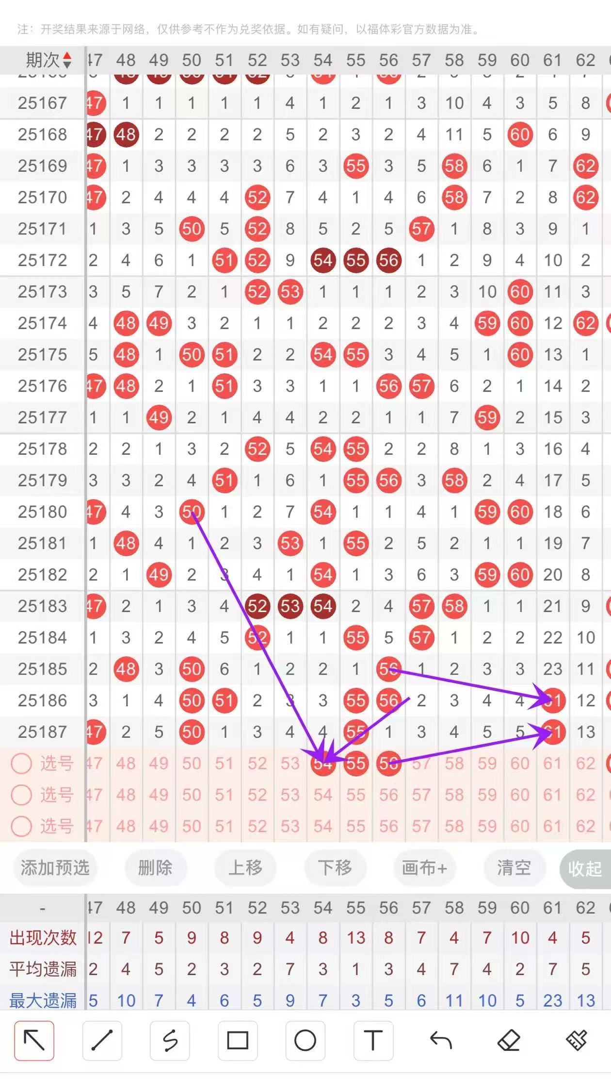 第三分区,我们从40号到60号去选啊。我这里跟大家推荐了一个三连号54、55和56。嗯,这个三连号开出的可能性还是非常大的,即使开不出三连号也会有一两个号码出现。为什么这样说呢?大家可以根据这个4750的这样的一个结构,我们把这个47号以50号为参照物吧,可以去把这个47往右运动,那么我们就会发现啊,有一个54这样的一个号码,所以说56呢,也是这个61的这个等腰梯形的一个号码,所以就构成了54 55 56