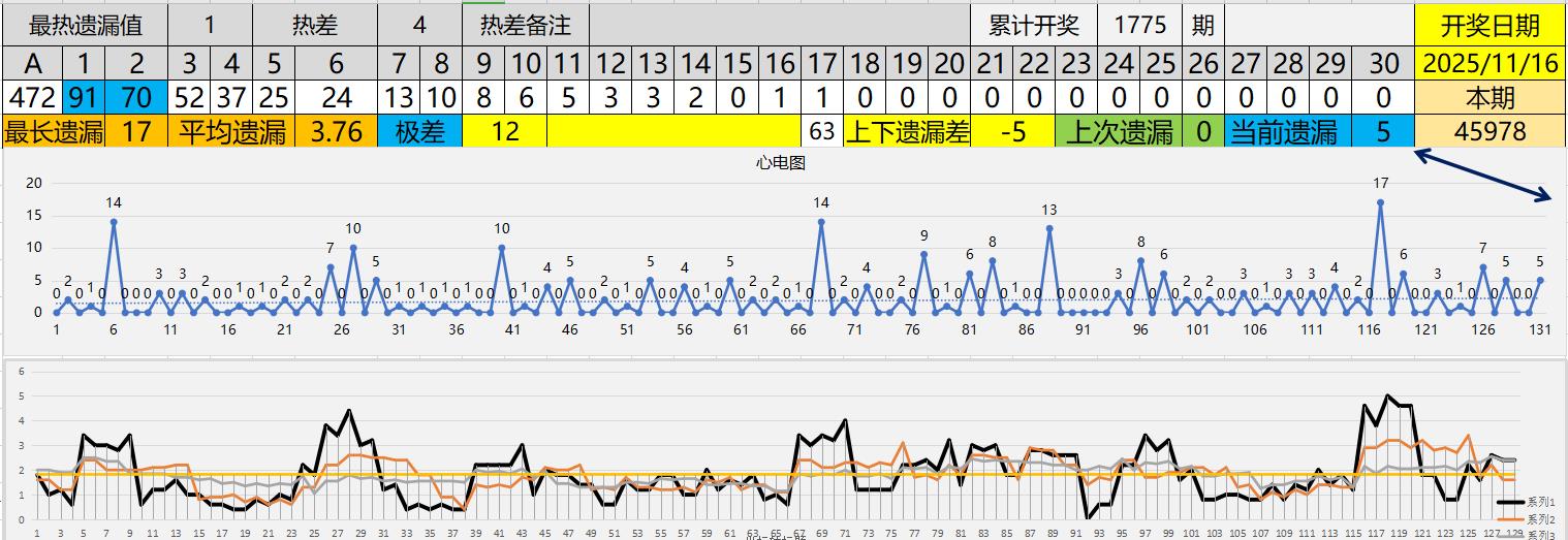 2、历史最长遗漏纪录17,当前遗漏5,距离极值还有12期。上次开出是遗漏5,形成了双底对称等间周期,特征明显,可关注。