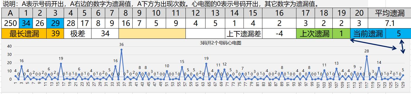 3码开其中任意2码,历史上累计开出250次,平均大概每4期就会开1次,经常能遇到它开2码的情况。