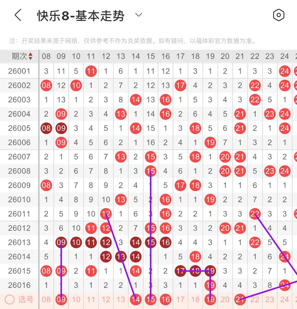 11-20区:本区间上期开出了一个号码,从号码走势图上看,该区现属于热号区,上期出号个数突减,本期注意出号个数突增的可能,出号个数在三个号码左右,有出号走势的号码有14号,斜连出号走势,15号,上下对称出号走势,防14.15.16开出三连的可能,19号,走三重,复制14出号走势形态出号。