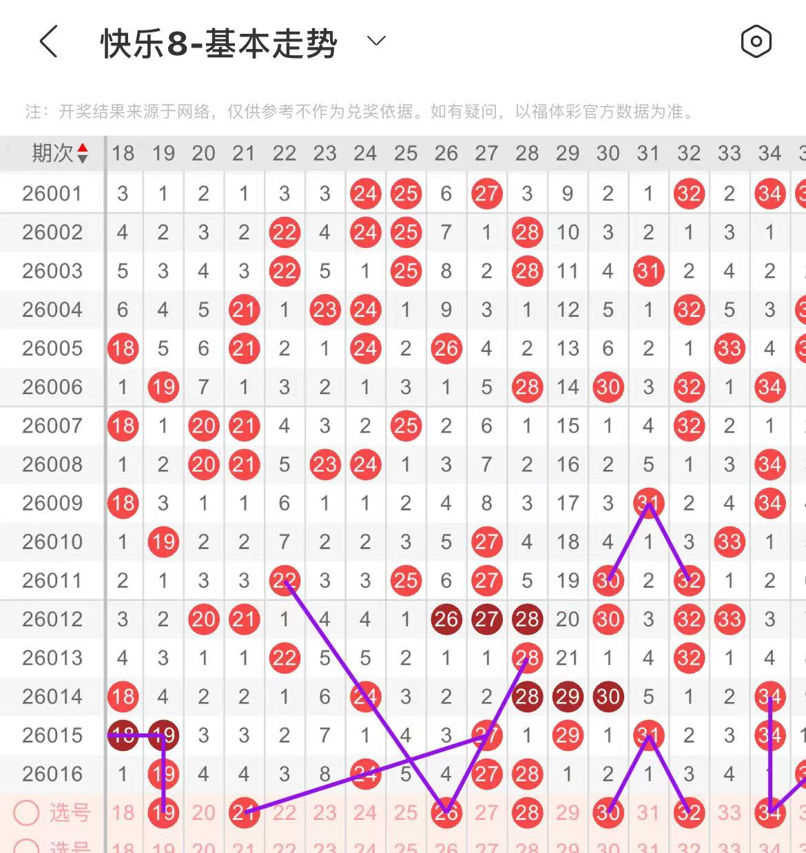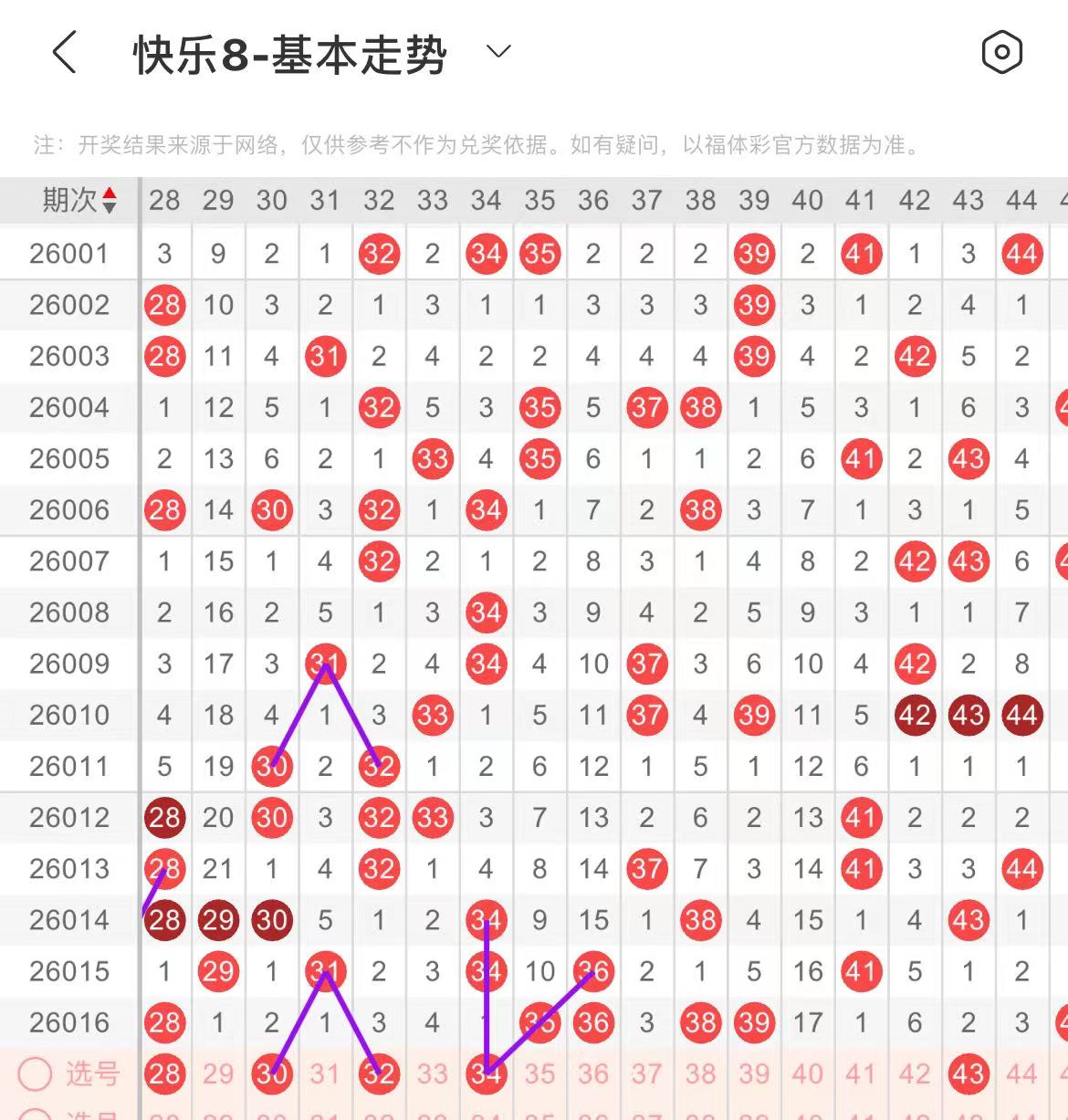 21-30区:本区间上期开出了三个号码,从号码走势图上看,该区现属于热号区,出号个数应该还能保持在三个号码左右,在选号上可考虑多做选择。有出号走势的号码有21号,斜连出号走势,26号,双线斜连出号走势,28.30号,同出,热组合号码回补。