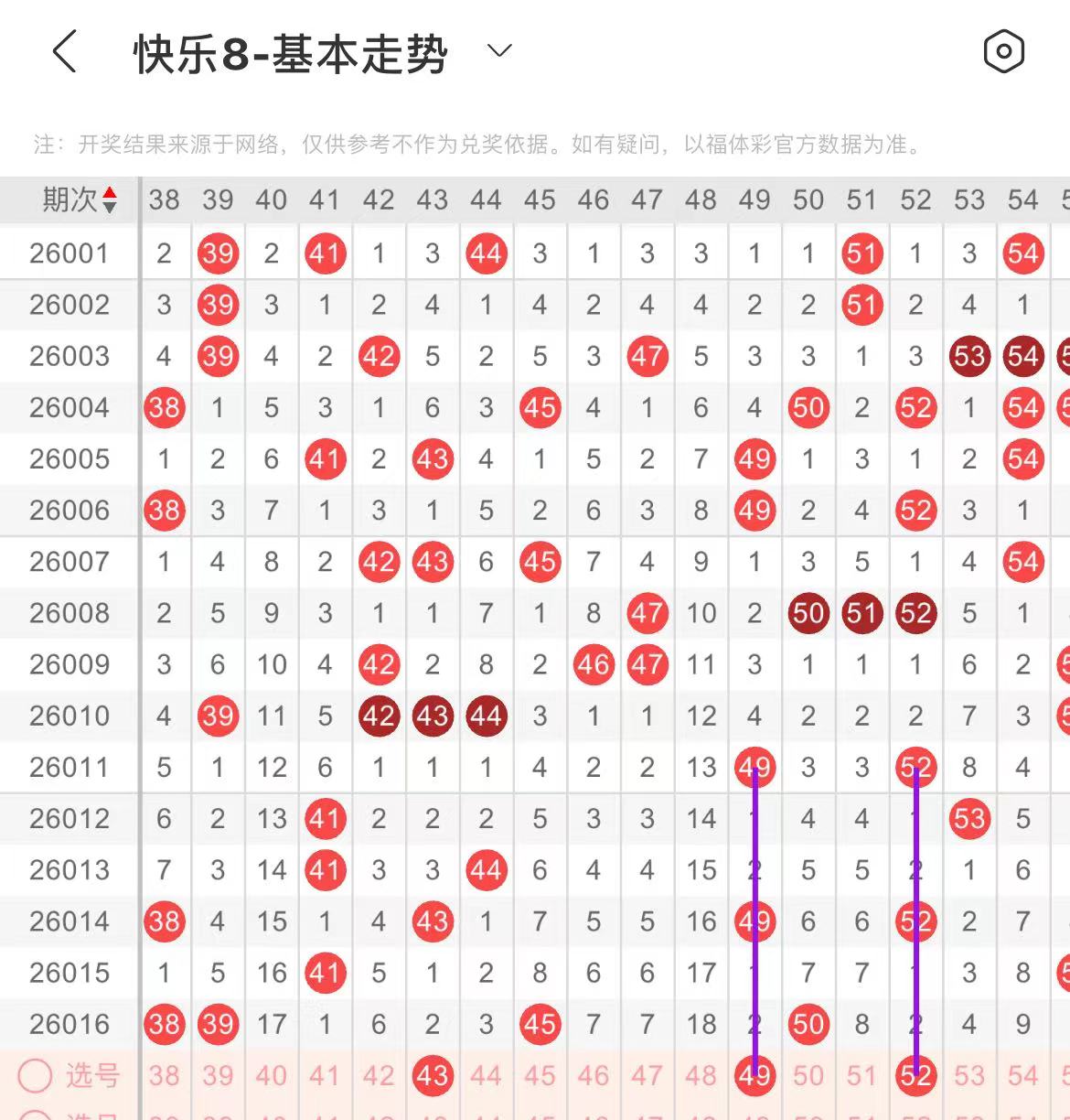 41-50区:本区间上期开出了两个号码,从号码走势图上看,该区现属于冷号区,在选号上建议以防为主,本期出号个数在一两个号码左右,有出号走势的号码有43号,做前半区号码回补防范,49号,隔期相同出号走势。