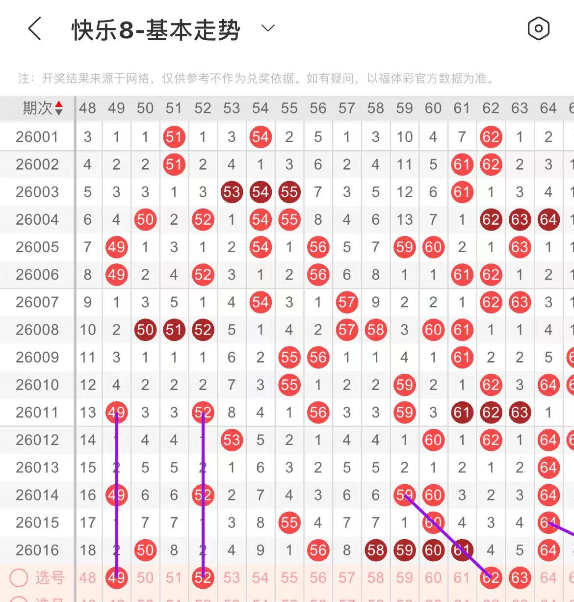 51-60区:本区间上期开出了四个号码,从号码走势图上看,本期可参考的号码走势甚少,出号个数有减少的可能,在选号上需谨慎。有出号走势的号码有52号,隔期相同出号走势。