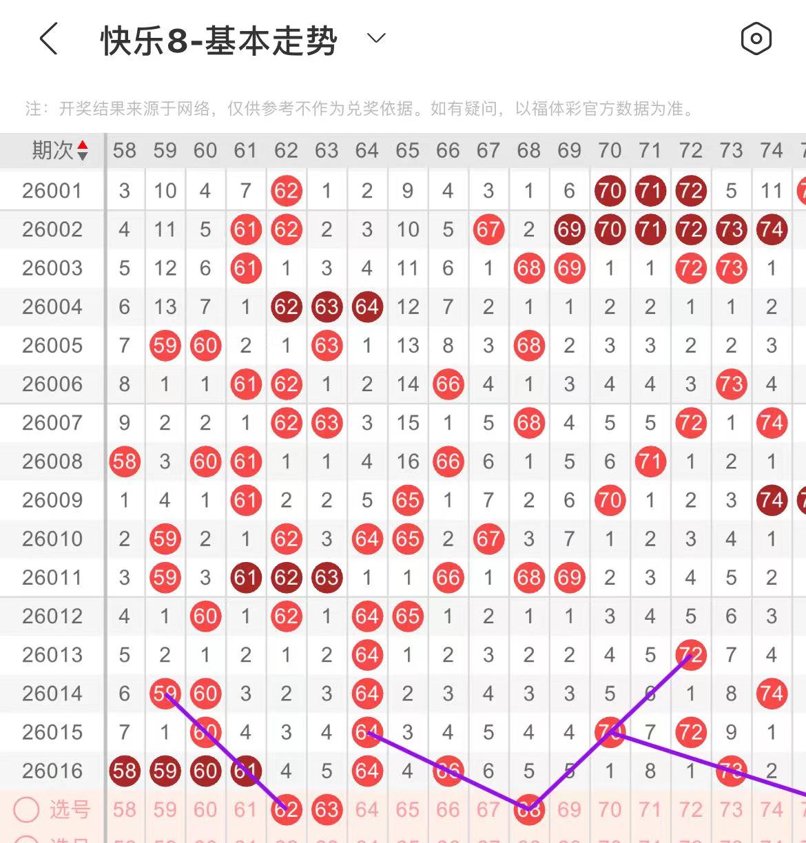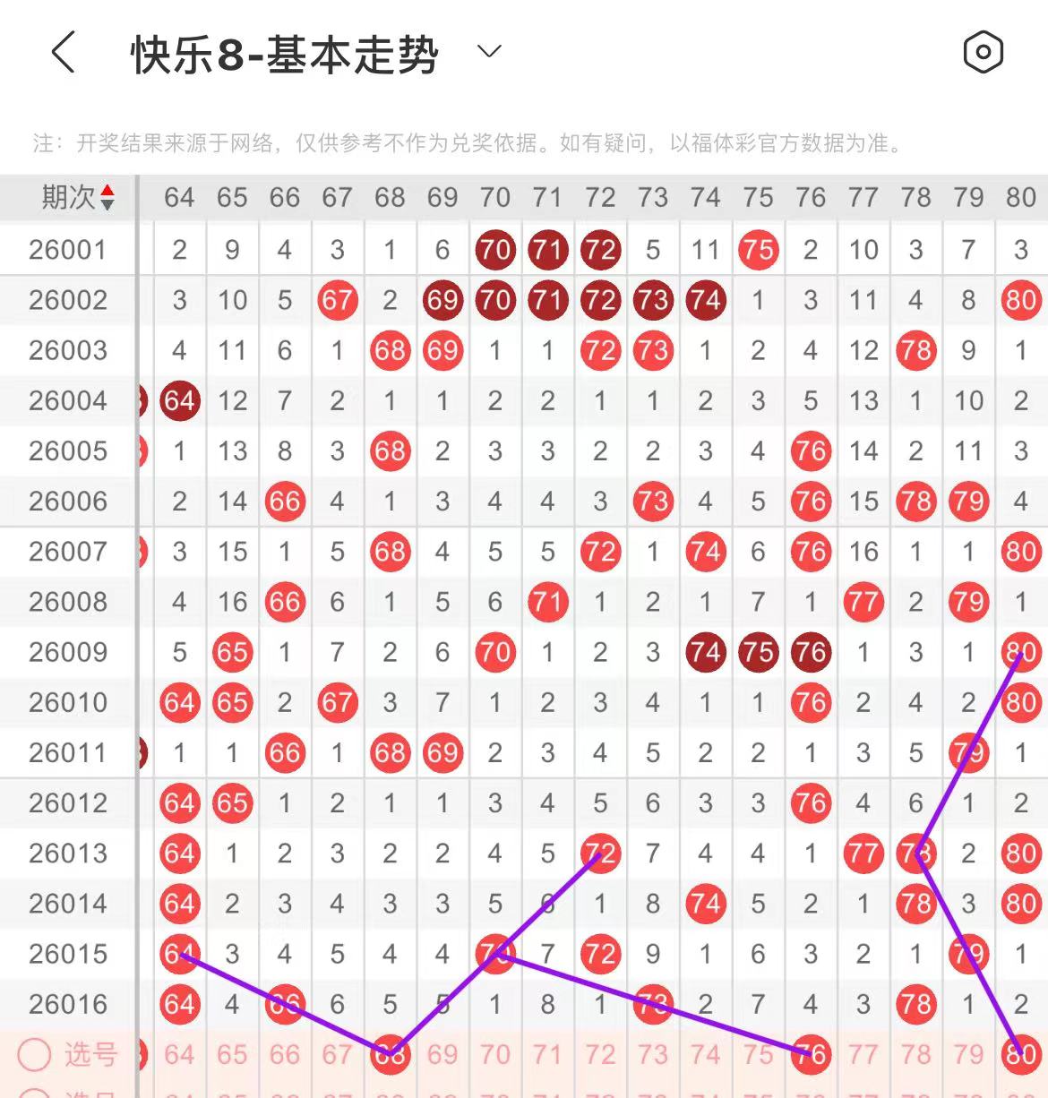 71-80区:本区间上期开出了两个号码,从号码走势图上看,该区现属于温号区,出号个数应该还能保持在两个号码左右,有出号走势的号码有76号,斜连出号走势,80号,回首掏斜连出号走势。