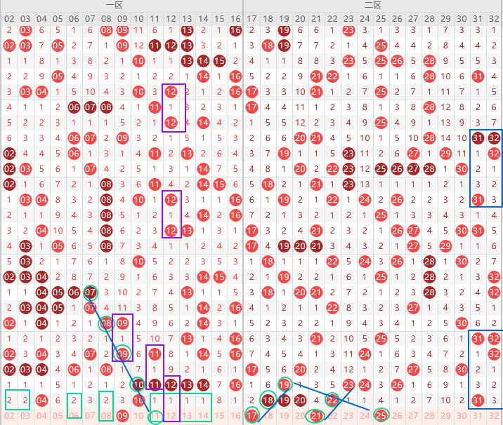 二区胆尾9尾,5尾,边号17 21 23 25 30 31出一码,重号18 19 20 22 31出一码,形态上17 25 21是斜连号,上图已勾画,遗漏值23 24 26三出一,今天25 28有机会出号,25遗漏值隔1 1隔2 2 隔3 3有概率本期隔4出,25只要出 37就能下,其次3开头防30 32出一,参考形态跟上面一样,上图已勾画,是没出边号重号,可以防守32,重号本期看好三连号下面出重,18 29 20三出一,杀掉18,19 20二出一,看好19出三重,本期有9尾19 29二出一,结论关注五码19 21 24 25 28防32