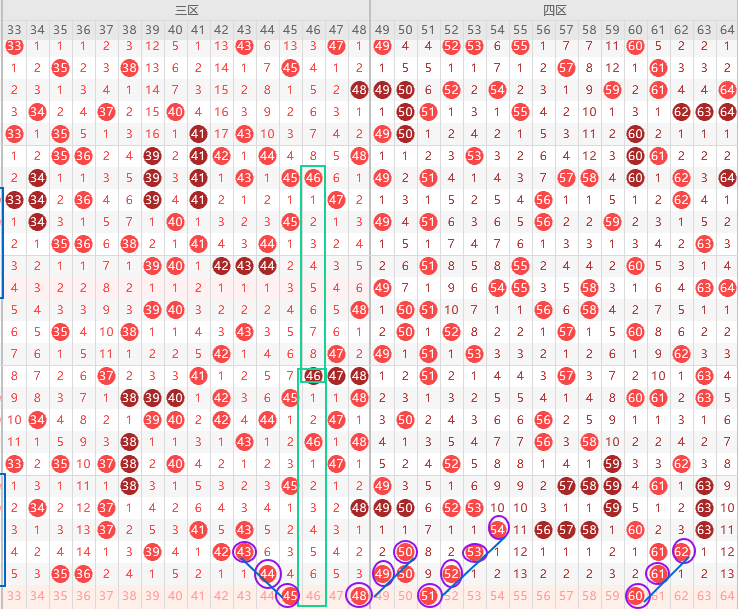 三区胆尾9尾1尾,边号34 37 43 45 48出一,形态上45 48是斜连号,上图已勾画,其次46遗漏值是一样,上图已勾画,遗漏值43 45二出一三区太冷,最近每期出3码,本期看好3开头1-2码,四开头2码,大概率出3-4码,结论关注五码34 37 43 45 48防39