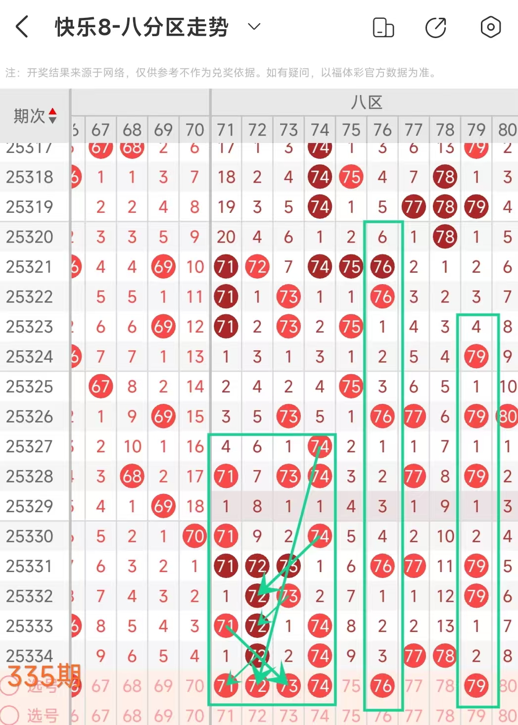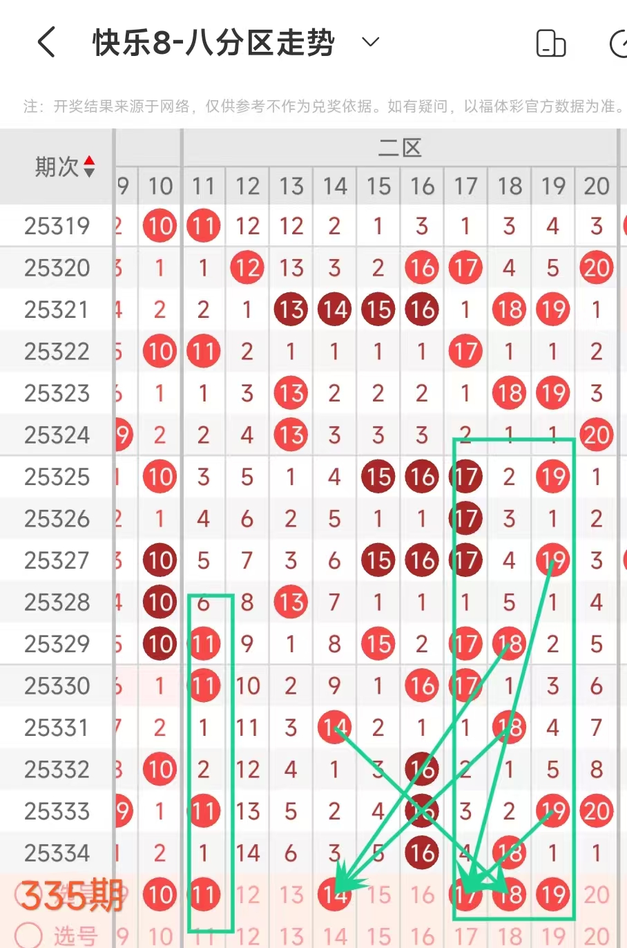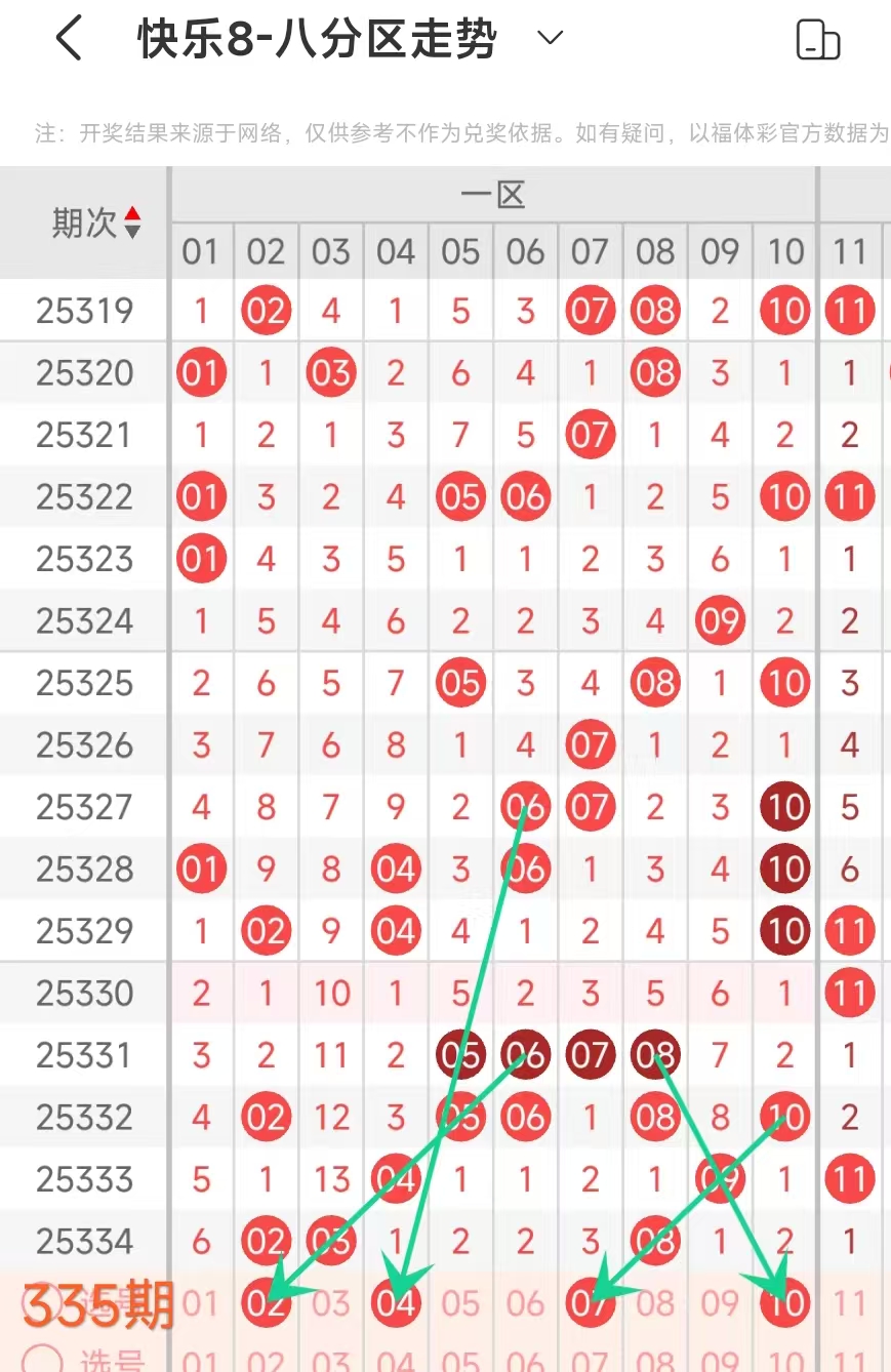 在快乐8的探索之旅中,通过对开奖走势图细致入微的观察,我们总结出一些具有参考价值的规律。几乎每一期开奖号码都呈现出以下显著特征:其一,大概率出现连号;其二,常常伴有边码;其三,遗漏值为1 2 3的号码频繁现身;其四,重号现象也较为常见。掌握这些要点,能为我们的投注提供方向指引。我们约定采用八分区走势图来展开分析。